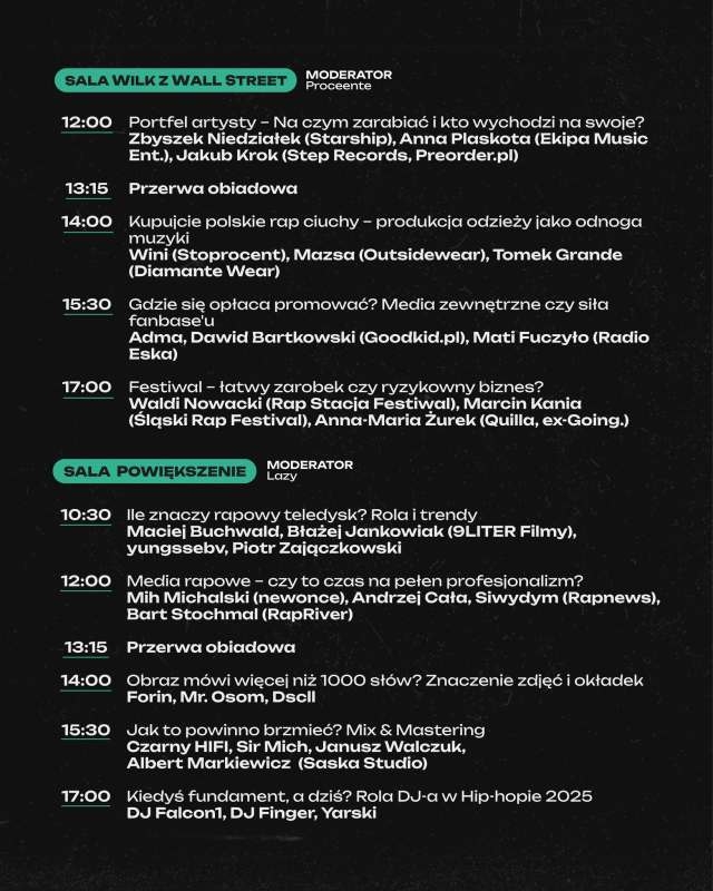 Dj-e, producenci, tancerze, raperzy, managerowie i wiele więcej – wszyscy dyskutujący w pięciu salach o tym, na czym znają się najlepiej. Zapowiada się ciekawy dzień. Pamiętajcie, że wszystkie rozmowy nagramy i opublikujemy na naszym kanale YT.